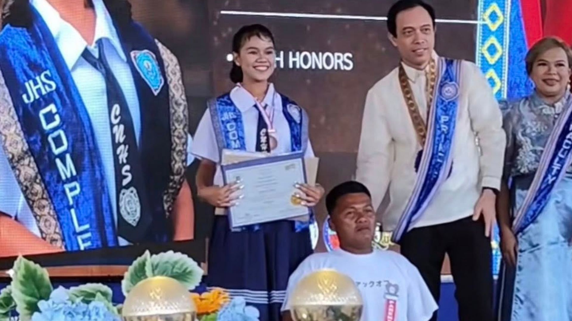 A video of the moment, now circulating on social media, shows Tatay Jun placing the medal around his daughter’s neck before posing proudly beside her. With immobile legs, he relies on his hands to move, making his presence on stage all the more meaningful.